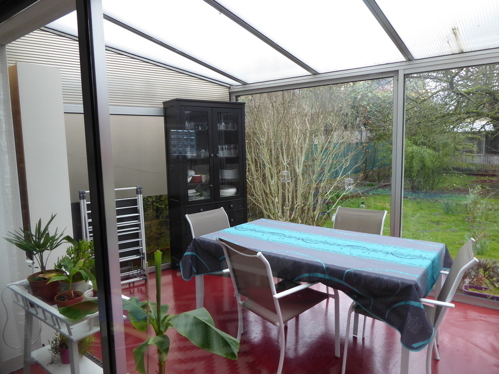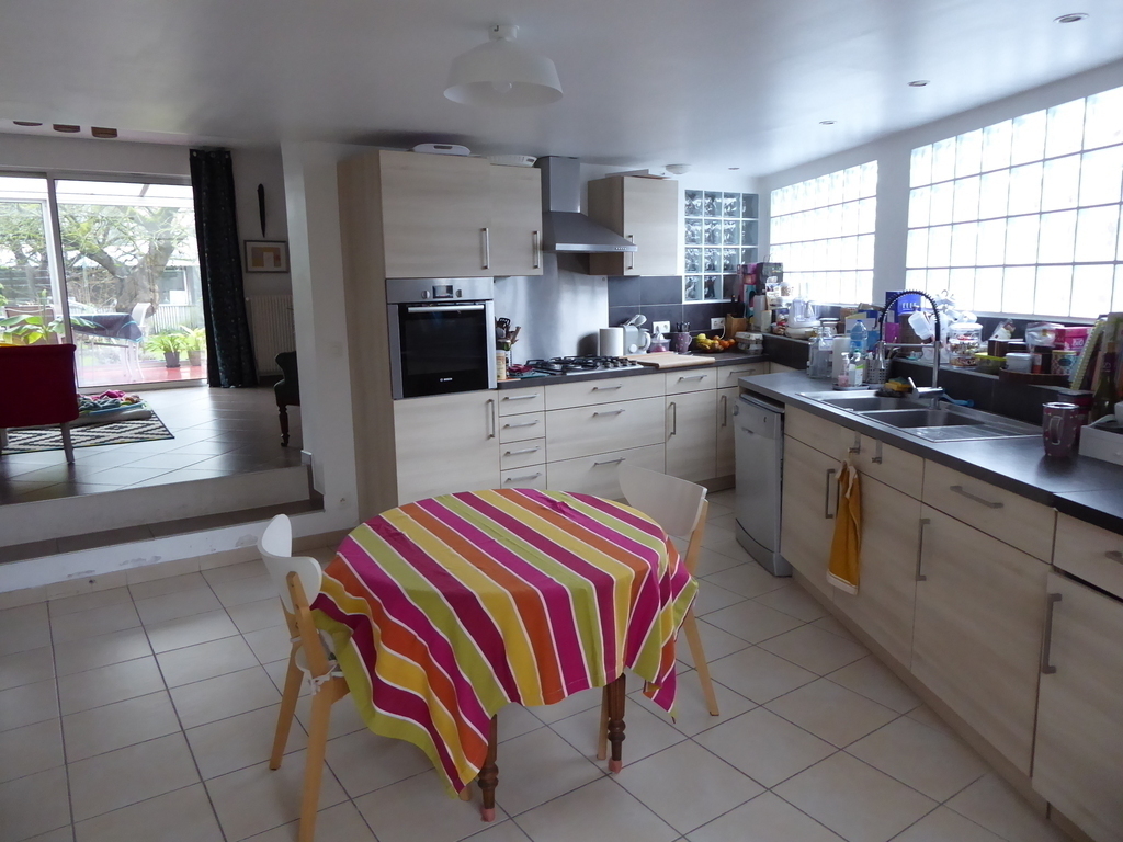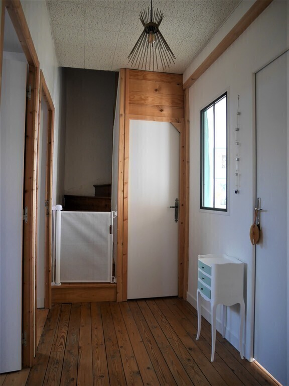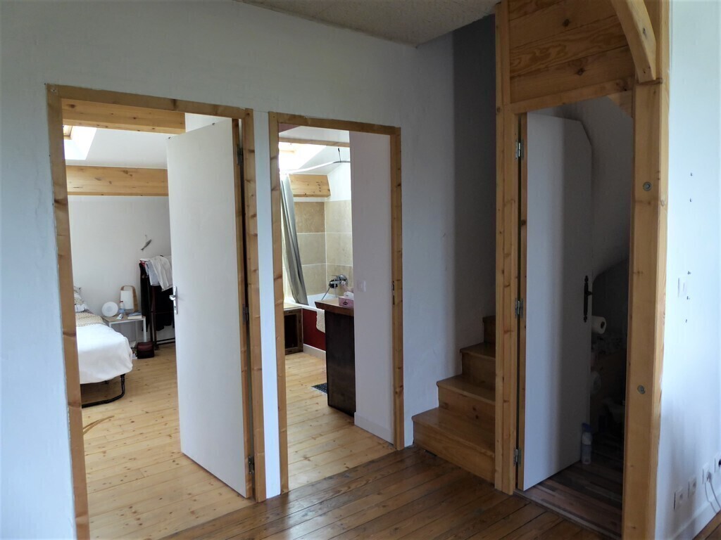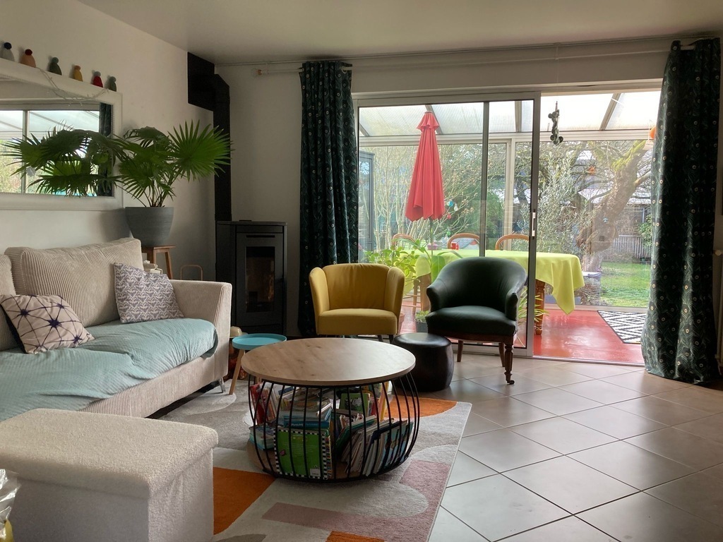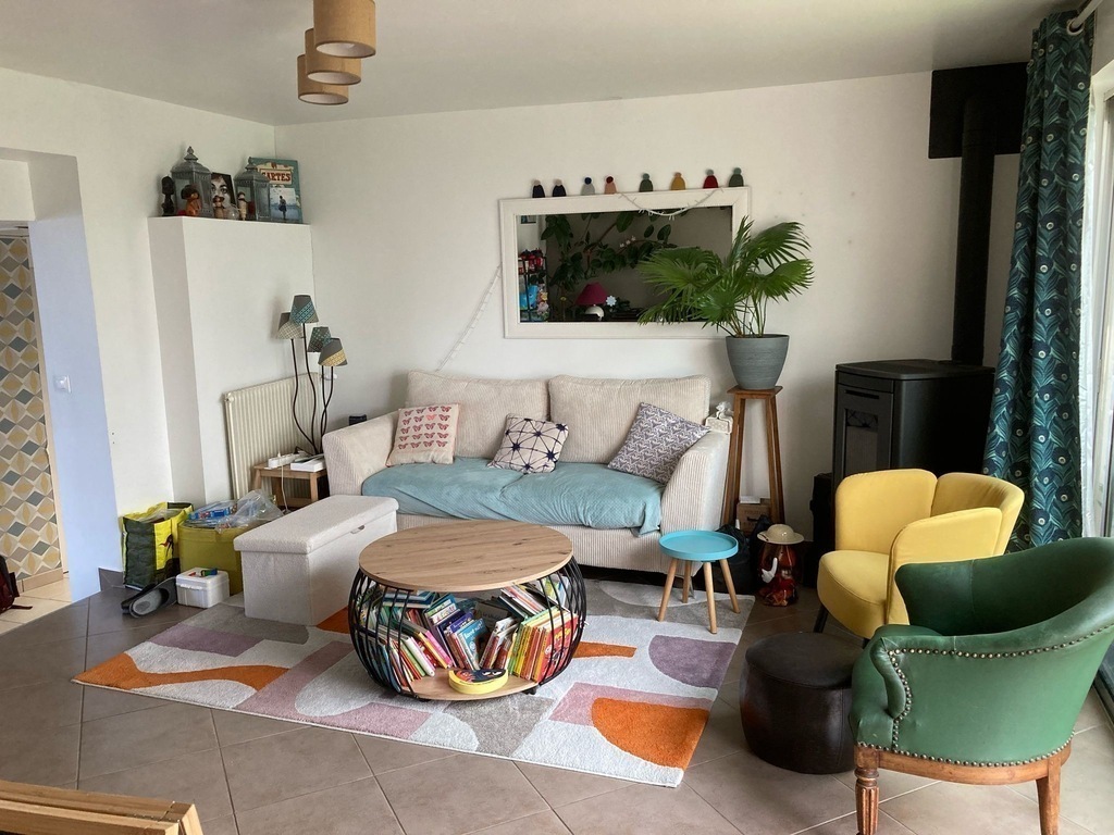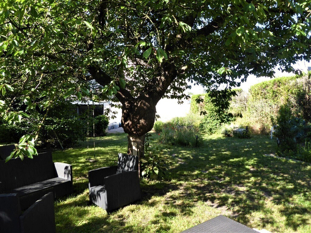 Old house of 120 m² + a veranda, on 2 floors. On the ground floor, kitchen, laundry, wc, living room with a pellet stove, dining room / games room / office space, and the veranda. On the 1st floor, 3 bedrooms, one with walk-in shower and small sink and 2 children's rooms, bathroom and WC. On the 2nd floor, 2 connecting rooms. The veranda overlooks a large garden with trees and flowers. Possibility to park a car at the bottom of the garden, in front of the garage.
