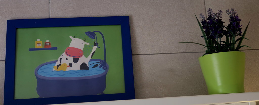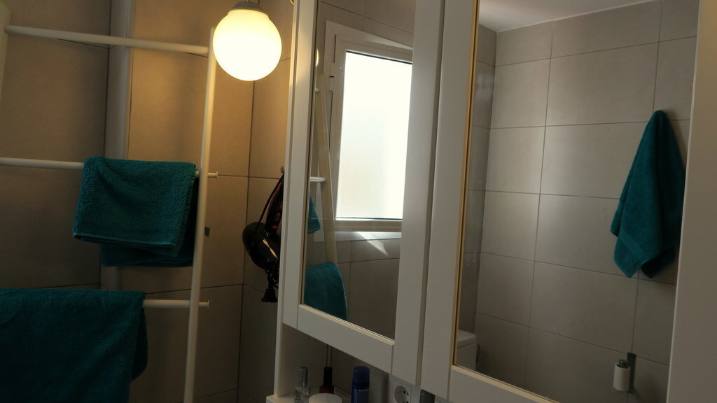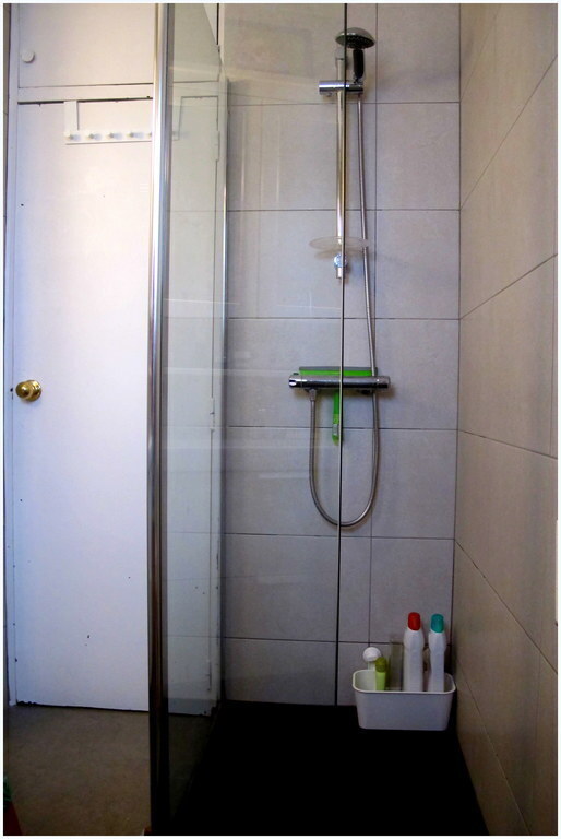 The bathroom has a walk in shower and a toilet. The master bedroom(double bed 150cm) has also a terras overlooking the common gardens from the neighbourhood. We can provide a carry cot. The other bedroom consists out of a bunk bed (2x 90cm).