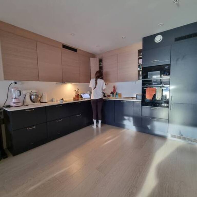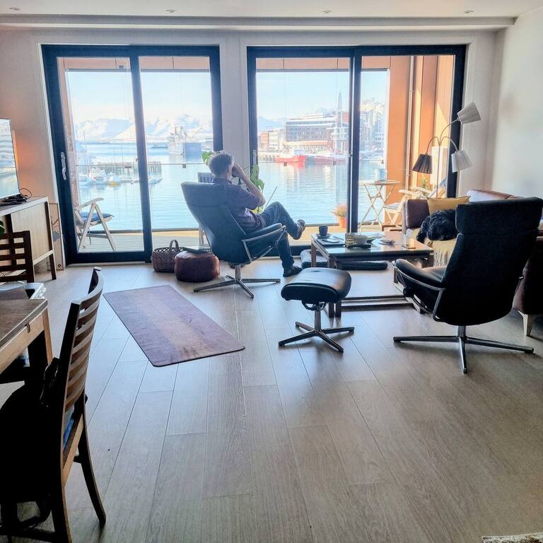 Vi bor i ei ny og moderne leilighet med sentral beliggenhet og utsikt over Tromsø havn. To soverom, praktisk innredning og heis.