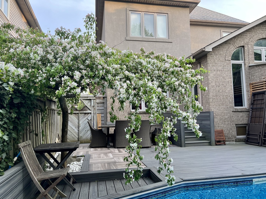 Outside, in the back yard, we have a nice wooden deck that surrounds a saltwater heated swimming pool and a small, well maintained, landscaped garden.